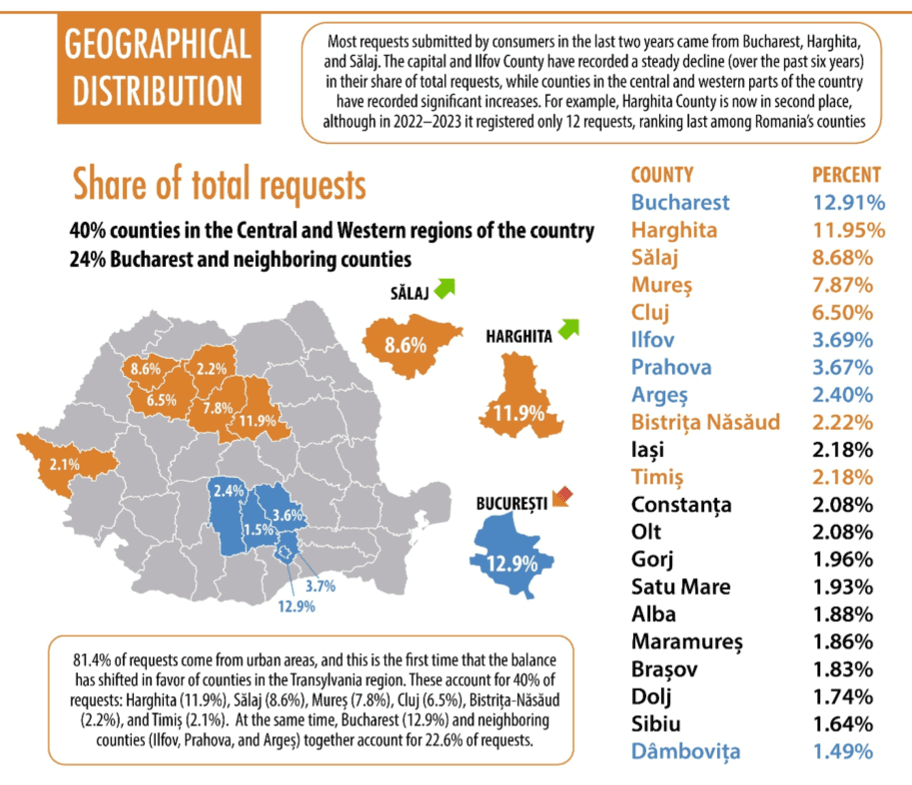 Geographical distribution: Most requests submitted by consumers in the last two years came from Bucharest (12.9%), Harghita (11.9%), and Sălaj (8.68%). A depolarization of requests from the Bucharest–Ilfov area toward counties such as Harghita, Sălaj, Mureș, and Cluj can be observed. Requests from these areas are often submitted by consumers’ lawyers seeking to avoid court proceedings or already involved in litigation with banks. In 2018–2019, Bucharest accounted for 28% of all requests, and in 2022–2023 the area around the capital concentrated 40% of requests (18.7% from Bucharest, 8.5% from Argeș, 5.6% from Ilfov, 4.5% from Prahova, and 3.3% from Dâmbovița). In the last two years, counties in central Transylvania accounted for 40% of requests: Harghita (11.9%), Sălaj (8.6%), Mureș (7.8%), Cluj (6.5%), Bistrița-Năsăud (2.2%), and Timiș (2.2%). At the same time, Bucharest (12.9%) and neighboring counties (Ilfov, Prahova, Argeș, Dâmbovița) together account for 24% of requests. In 2025, CSALB also received requests from Romanians living in Italy, Germany, Australia, and North Macedonia.